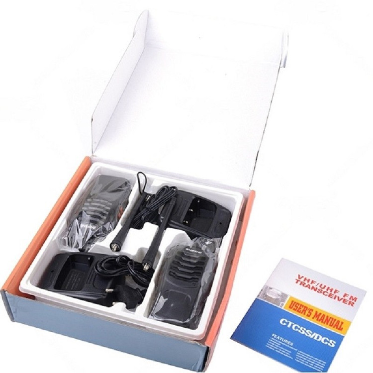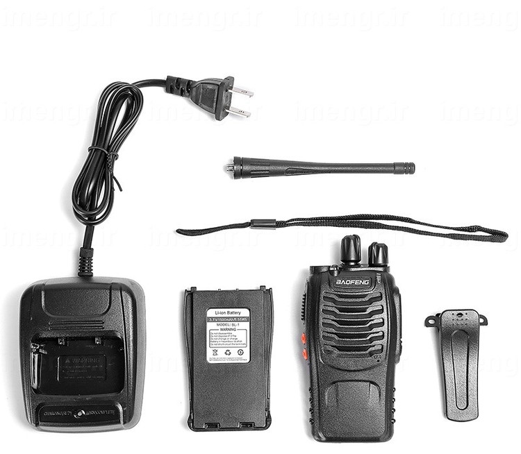 لوازم همراه یک عدد از بیسیم باوفنگ BF 888 : آنتن, باتری, بند, دفترچه راهنما, شارژر رومیزی, گیره کمری